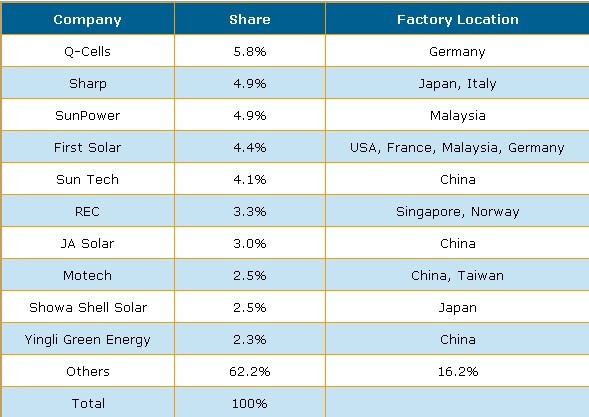 六 :依照2009年全球太陽(yáng)能電池(Cell)的產(chǎn)能來(lái)看,F(xiàn)irst Solar 是最大廠商,其產(chǎn)能達(dá)到10億瓦(1 GW),Q-Cells 與 Suntech 并列第二。在接下來(lái)的數(shù)年之內(nèi),主要的設(shè)備投資亦由這些領(lǐng)導(dǎo)廠商所帶動(dòng)。DisplaySearch預(yù)測(cè)到2013年,F(xiàn)irst Solar, Q-Cells, Suntech 等前三大廠商以及JA Solar, Motech, REC, SunPower, Yingli, Showa Shell Solar, and Sharp 等等會(huì)是全球前十大供貨商,合計(jì)產(chǎn)能將達(dá)16GW (160億瓦),將占2013年全球產(chǎn)能的38%。