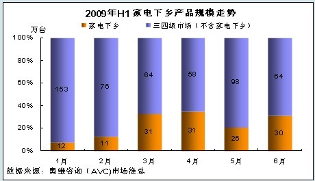 根據奧維咨詢(AVC)對家電下鄉市場的監測以及對全國市場零售規模的評估,2009年1-6月份彩電下鄉零售規模為141.09萬臺,占三四級市場的總量的21.54%。