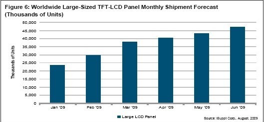2009年整個第二季度,全球大尺寸LCD面板出貨量比第一季度上升了43%,比2008年第二季度上升了12%。這應(yīng)歸因于全球經(jīng)濟好轉(zhuǎn)、中國市場需求旺盛、新型號的推出、向16:9面板的轉(zhuǎn)變、以及越來越多地使用LED背光技術(shù)。