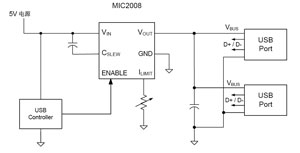 圖7是一種輸出限制電流可調(diào)節(jié)的USB端口電路。該電路由MIC2008作功率分配開關(guān),由USB控制器對(duì)功率分配開關(guān)實(shí)現(xiàn)控制。限定的電流由外設(shè)電阻R來(lái)設(shè)定(限制電流范圍為0.2~2.0A)。該功率分配開關(guān)的輸出電壓上升率(啟動(dòng)時(shí)間)可由外設(shè)電容C來(lái)設(shè)定,內(nèi)部有過(guò)熱保護(hù)及輸入電壓過(guò)低時(shí)輸出鎖存保護(hù)。