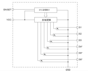 該器件主要特點(diǎn):輸入電壓范圍為1.8~5.5V;內(nèi)部有6個(gè)低端N溝通MOSFET開關(guān),每個(gè)開關(guān)都是獨(dú)立的;可采用單個(gè)串行控制線(S2C線)對(duì)各個(gè)開關(guān)實(shí)現(xiàn)通、斷控制;靜態(tài)電流少,典型值為3μA;每個(gè)開關(guān)可驅(qū)動(dòng)208mA;無(wú)須其他外圍元件;12引腳TSOP封裝;工作溫度范圍-40~+85℃。