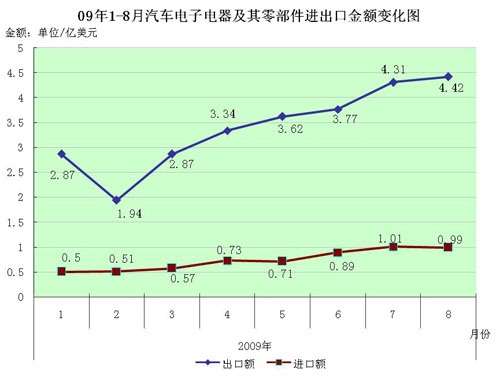 一、 2009年1-8月份國內汽車電子電器產品出口量一路上揚
