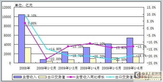 2009年3月重點企業主營收入累計實現2388.0億元,在國外市場需求低迷不振,出口交貨持續走低的情況下大幅回升,相對2月,主營收入同比降幅回升了近9個百分點,二季度則進入平穩調整。重點企業出口交貨2009年初持續下滑,5月份開始出現觸底回升跡象,但出口形勢依舊不容樂觀。預計振興規劃各項措施的不斷落實,將為電子信息產業發展帶來增長動力。