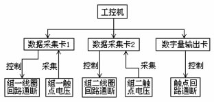 需要注意的是,當觸點電壓為交流信號時,為了保證電壓有效值的計算精度,采集卡在一個工頻周期內要完成16個采集通道至少320次的AD轉換,這就要求采集卡的采集速率非常快,本裝置采用的是研華的PCL-818HG。每塊采集卡還提供了一個20-PIN數字輸出口,用來控制試品線圈回路的通斷電。試品觸點回路采用一塊多通道的數字量輸出卡,通過固態繼電器實現對兩組試品觸點回路的通斷電控制。繼電器可靠性檢測裝置的結構框圖如圖1所示。