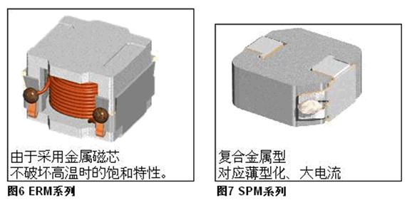 一直以來(lái),一般的電感是以Ni-Zn系的鐵氧體作為磁芯的,這種材料雖然強(qiáng)度較高,但是飽和磁束密度較低,高溫時(shí),飽和磁束密度會(huì)降低,在電子部件驅(qū)動(dòng)日趨低電壓,大電流化的今日,這類小型化產(chǎn)品無(wú)法對(duì)應(yīng)大電流。要在高溫環(huán)境下通過(guò)更大的電流,就要使用由飽和磁束密度高且損耗小的Mn-Zn鐵氧體磁芯構(gòu)成的電感。一般而言,Mn-Zn鐵氧體材料的電感,磁芯的中腳部分會(huì)形成Gap,磁芯的中腳部分開始較容易飽和。如圖4 VLM所示,結(jié)構(gòu)是由口字形磁芯(磁性結(jié)合型磁芯)和棒狀磁芯組成。采用了這種構(gòu)造后,將本來(lái)容易產(chǎn)生飽和的中心磁芯的中腳部分分成上下兩部分,在上下根部形成Gap,不易出現(xiàn)部分飽和,能夠容許更大電流通過(guò)。另外,由于Gap分散在卷線的上下兩端,可以減少?gòu)腉ap泄漏的磁束對(duì)卷線的影響。過(guò)電流損失減少,電源效率也提高了。再者,還可使用金屬磁芯的電感。它的飽和磁束密度更高,受溫度影響飽和電流的變化很少。如圖6 ERM6050所示。金屬磁芯的電感還有另外一款復(fù)合金屬型的電感(圖7 SPM系列)。