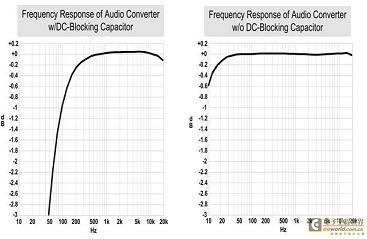 用來隔離DC電流的最常見技術是采用去耦電容,如圖1所示。在信號路徑中放置一個電容可以創(chuàng)建一個高通濾波器,其角頻率由耳機阻抗(R)和去耦電容(C)設置,等于1/(2πRC)。通常人的耳朵能夠聽到聲音頻率最低為20Hz。根據(jù)這個下限和耳機的典型阻抗,可很容易地計算出所需的電容值。對于20Hz的角頻率,電容容值取500uF。