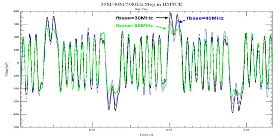 在圖9中分別為fbase=30/40/50MHz時,HSPICE仿真出的接收端波形。可以看到fbase=50MHz時,低頻的碼型(長1或長0)幅度較低些,與實測RX端波形的比較接近。在使用HSPICE仿真時,fbase=50MHz時的仿真時間遠小于最開始的頻率設置(fbase = 10MHz)。在圖10中,對比了fbase=50MHz時HSPICE仿真的RX端波形與實測波形,兩者一致性比較好。