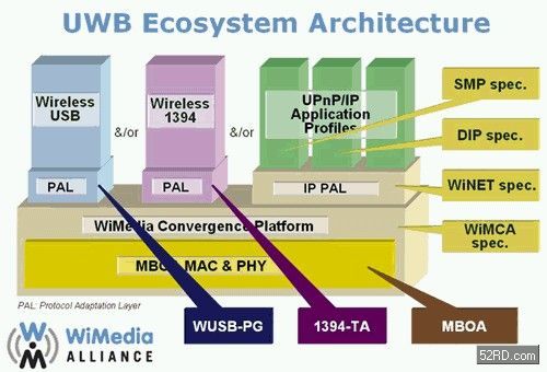 Wireless USB 1.0標(biāo)準(zhǔn)是在2005年5月12日正式發(fā)佈,它的實體層(PHY Layer)、媒控層(MAC Layer)是使用MBOA組織所訂立的超寬頻(UWB)技術(shù),在PHY層、MAC層之上再搭建一層WiMEDIA Alliance所訂立的聚合層(Convergence Layer,IEEE 802.15.3a),在聚合層之上再依據(jù)不同的無線傳輸應(yīng)用而訂立不同的協(xié)定因應(yīng)層(Protocol Adaptation Layer;PAL),最后才將WUSB的通信建立于最上端,如此使WUSB運(yùn)作。(附註:MBOA(Multi-Band OFDM Alliance)于2005年3月與WiMEDIA Alliance合併。)
