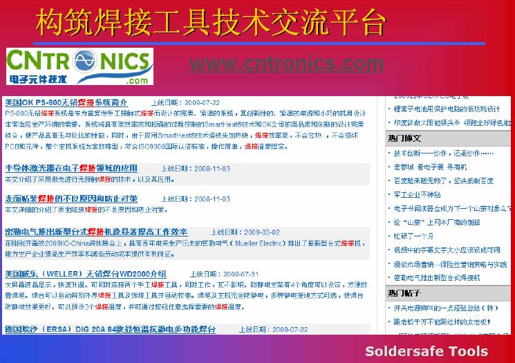 電子元件技術網http://www.yttele.cn/club/muellerindex?ref=top_nav可以提供給我們一個平臺,在這個平臺里面,我們可以對于焊接設備的一些使用性能可以進行一些討論,對于新型焊接工藝本身的工藝特點進行一些分析,對于焊接材料,對于新工藝、新材料我們可以進行相應的分析,大家也可以直接,如果網絡方便的話,登錄到這個網站,我相信在這個平臺上可以一起努力,為之后的行業發展起到更多的推動作用。