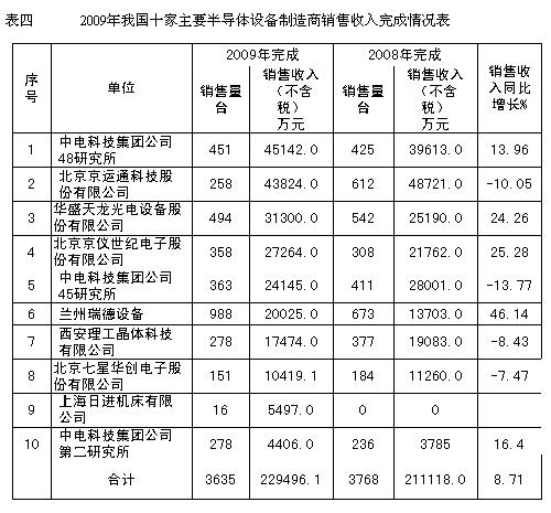 2009年我國十家主要半導體設(shè)備制造商完成的半導體設(shè)備總銷售收入(不含稅)達到22.95億元,同比增長了8.71%。半導體設(shè)備出口交貨值為4127.4萬元,同比下降了31.2%。