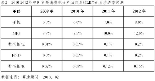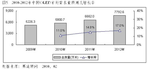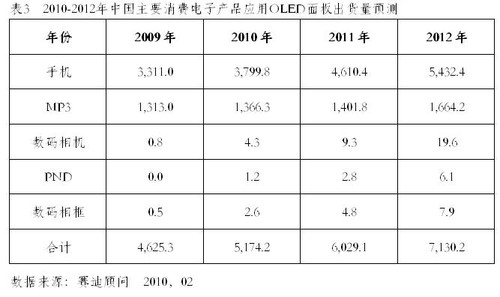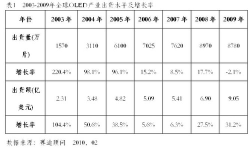 2010年4月13日,中國權威ICT研究與管理咨詢機構賽迪顧問股份有限公司在“2010中國消費電子市場年會”上發布《2009-2010年中國OLED產業發展研究年度報告》顯示:隨著手機和MP3/MP4等應用產品需求的推動,OLED顯示屏市場自2003年開始快速成長,到2009年,全球OLED出貨量達到8780萬片,由于受到全球終端產品有所減緩的影響,特別是手機和MP3市場出貨量的下滑,加上PMOLED全球產量明顯降低,但AMOLED在得到面板廠商大力推動下,特別是像諾基亞、三星、索愛等終端廠商,均在2009年推出一系列采用AMOLED屏幕的手機,在應用市場的推動下,AMOLED有了較大的增長,不過OLED總體仍有所下滑。伴隨著AMOLED出貨量的增長和市場比例的提升,OLED整體產值有明顯的增長,2009年產值達到9.05億美元,較2008年成長31.2%,出貨量在下滑的同時,而出貨額保持增長,AMOLED貢獻極為明顯。