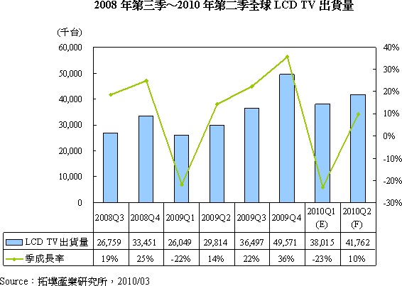 每年第一季歐美地區(qū)普遍缺乏節(jié)日刺激銷售,因此當(dāng)季全球LCD TV出貨量往往呈現(xiàn)衰退狀況。雖然業(yè)界期望中國(guó)春節(jié)能改變第一季衰退的命運(yùn),但2010年春節(jié)中國(guó)市場(chǎng)LCD TV銷售量?jī)H214萬(wàn)臺(tái),遠(yuǎn)低于各界預(yù)估的400萬(wàn)臺(tái)。拓墣產(chǎn)業(yè)研究所張乘維經(jīng)理估計(jì),2010年全球LCD TV首季出貨量?jī)H3,802萬(wàn)臺(tái),較2009年第四季下滑23%。