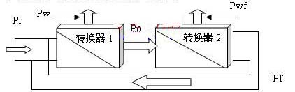 第二種工作模式是引入能量反饋的情況下,能量轉換如圖3所示:轉換器1為需要例行使用的電源轉換器,轉換器2為用于能量反饋的轉換器,Pi為系統(tǒng)外給轉換器1的輸入能量,Pw為轉換器1轉換過程中的消耗能量,Po為例行使用電源轉換器1正常應輸出的能量,同時也是轉換器2的輸入能量;Pwf為用于能量反饋的轉換器2轉換過程中的消耗能量,Pf為轉換器2反饋給電源轉換器1的能量。