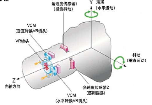 鏡頭防抖是通過鏡片的移動來補償相機的抖動,它由傳感器,微處理器,補償鏡片控制組,驅動控制部分組成,依靠補償鏡片的移動來校正手抖引起的光線偏移,如圖1,鏡頭不同,設計上有差異,但基本上都是透過補償鏡片組來補償。CCD防抖是通過感光元器件CCD(或CMOS)放在一個可移動支架上來,通過傳感器感知相機的抖動,由微處理器計算相應的移動量,由驅動部分對CCD移動,以達到防抖目的。目前,一般相機的防抖(CCD防抖或光學防抖)不是無限可以補償,一般為2~~3級,按表一來說,假設安全快門1/125,2級,快門速度1/30,快于此速度,容易拍清晰的照片,由此類推,3級,快門速度為1/15。表2為三種防抖方式的比對表。