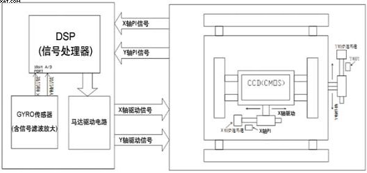 由圖2看出,在3D圖面上,Z軸有自動聚焦功能,Z軸移動對成像基本沒有影響,有影響是在X軸(PITCH)與Y軸(YAW)。圖4為在晚上拍照,無防手抖與有CCD防手抖的結果。圖5為CCD防抖系統框架,CCD防抖是在鏡頭上增加CCD支架,利用步進馬達對X軸,Y軸的驅動,使CCD移動來補償CCD的抖動。MEMS陀螺儀選用要有X,Y軸Gyro芯片,內部含放大,低通,高通濾波,這樣可以大大減少相機的尺寸。Gyro信號連DSP的ADport,DSP的AD是10bit,滿足設計要求。資料運算用相機本身的DSP處理,可以減少一微處理器(Micro),降低成本。DSP對Gyro傳來的ω信息進行運算,計算補償量,通過馬達驅動電路驅動X,Y移動來達到補償的目的。X軸,Y軸的PI信號是Lens反饋DSP信息來校正CCD與Lens中心重合,避免補償過程超出Lens設計的補償范圍。