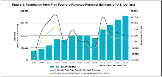 2010年總體純晶圓代工營業收入將從2009年的178億美元增長到248億美元。今年的預期營業收入將比2008年的199億美元上升24.6%。iSuppli公司預測,晶圓代工營業收入到2013年將達到359億美元,復合年度增長率為12.5%。