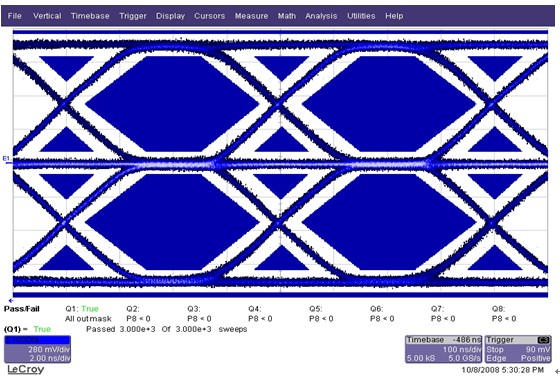 經過研發與測試工程師的討論,在目前不改動系統設計的前提下,采用微調RDAC電阻的方法來增大信號輸出電平幅度以解決信號眼圖的問題。經過調整后,眼圖測試通過,波形見圖6。