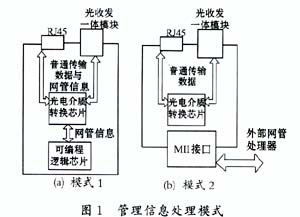 收發器網管功能的實現有兩種方式:一種是在收發器電路板上配置網絡管理信息處理器——可編程邏輯芯片來處理網管信息,該芯片利用OEMC上的雙向管理指令接口(Managenent Data Input/Output,MDIO)、管理數據同步時鐘輸入接口(ManagenentData Clock,MDC)及被管理信息輸入/輸出管腳等接口來獲取管理信息,管理信息與網路上的普通數據共用數據通道,如圖1(a)所示。第二種方式如圖1(b)所示,收發器上沒有管理信息處理器,收發器外部的網絡管理者通過MII接口獲取管理信息。可見,有網管功能的收發器,其元器件種類及數量遠遠多于無網管收發器,相應地,其布線復雜,開發周期長。
