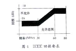 雙絞線中的每對導線以雙螺旋形結構相互纏繞。如圖2所示,共模電流Icom在兩根導線上以相同方向流動,并經過寄生電容Cp到地返回。在這種情況下,電流產生大小相等極性相同的磁場 ,它們的輸出不能相互抵消,引起射頻干擾,嚴重時有可能會造成電路板癱瘓。因此,設計者必須采取措施予以防范:除了保證布線合理外,選擇有效的濾波元件也是重要的一方面。磁模塊的共模扼流器部分可以有效地減少共模信號引起的射頻干擾。如圖3所示:共模電流以相同的方向流過共模扼流圈繞組的每一邊,建立大小相等相位相同的相加磁場使共模扼流圈對共模信號呈現高阻抗,通過共模扼流圈的共模電流大大地減弱。磁模塊主要的參數有:漏電感、線間電容和回損。一般地,漏電感和線間電容越小性能越好,而回損應當符合ANSIX3.263 TP-PMD規定,如圖4所示。