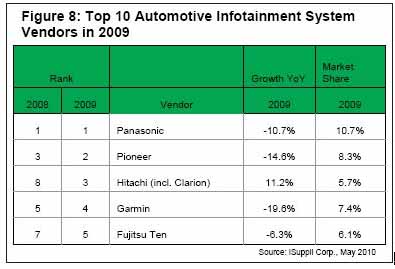 另一家日本一線供應(yīng)商日立2009年排名第三。該公司2008年排名第八,是2009年10大廠商中營(yíng)業(yè)收入增長(zhǎng)的兩家廠商之一。日立2007年與Clarion Co. Ltd.合并,合并營(yíng)業(yè)收入2009年占全球信息娛樂市場(chǎng)的5.7%。