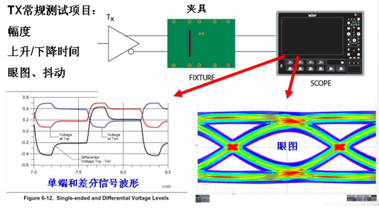 對(duì)于絕大多數(shù)高速串行信號(hào)的測(cè)量,通常包括了發(fā)送端測(cè)量和接收機(jī)測(cè)量,又稱為TX測(cè)量和RX測(cè)量。目前,對(duì)于板級(jí)設(shè)計(jì)的硬件工程師,對(duì)發(fā)送端測(cè)試已經(jīng)非常熟悉。通常使用高帶寬示波器加上測(cè)試夾具或差分探頭來測(cè)量,測(cè)試項(xiàng)目主要是眼圖、抖動(dòng)、上升/下降時(shí)間、幅度等等,探測(cè)點(diǎn)的位置一般是串行鏈路的發(fā)送端或接收端,由于測(cè)量的都是高速收發(fā)器芯片發(fā)送出的信號(hào),對(duì)于這一類測(cè)試通常都稱為發(fā)送端測(cè)試,如下圖2為典型的TX測(cè)試的示意圖。