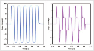 圖2±100V電源時典型的超聲波發送器輸出,以及流入100Ω和300pF并行負載的相應瞬時電流