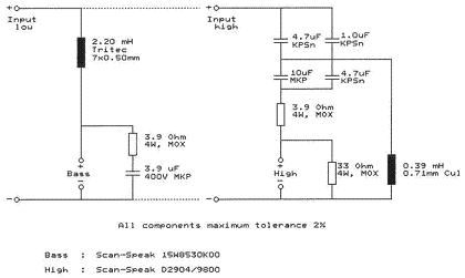 如果允許低音范圍的聲壓級低于100dB,則可使用一只口徑較小的低音單元。在這樣低的聲壓級下通常難以使低頻響應(yīng)下潛到50Hz以下,但本音箱使用的Scan-Speakl5cm低/中音單元在低頻下卻能產(chǎn)生足夠的聲輸出并能令人滿意地重放2kHz-3kHz的聲音,這樣就不必使用中音單元了。某些口徑較小的低音單元設(shè)計成能在較小的音箱中令人非常滿意的重放低音,本音箱使用的低/中音單元就是一個很好的例證。