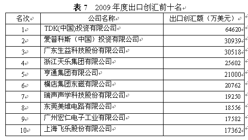 對于中國電子元件行業(yè)的外貿(mào)出口來說,2009年是一個從谷底緩慢爬升的過程。本屆元件百強中出口創(chuàng)匯總額為52.48億美元,同比下降10.38%,占銷售收入總額的28.81%,與上屆元件百強的出口總額相比,下降了9.83%。由于金融危機導(dǎo)致了外需萎縮,而且我國刺激內(nèi)需的各項政策效果明顯,一些元件百強企業(yè)開始更多地關(guān)注國內(nèi)市場,所以本屆元件百強的出口創(chuàng)匯額雖然下滑,但整體銷售收入仍然獲得增長。