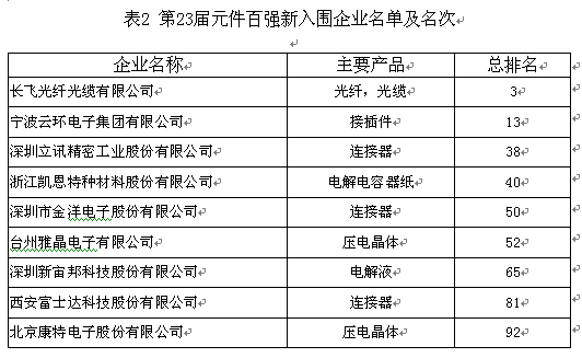 本屆元件百強中共有9家新企業(yè),其中,我國光纖光纜制造業(yè)的龍頭企業(yè)長飛光纖光纜有限公司表現(xiàn)最為突出,一舉斬獲本屆元件百強的季軍寶座。而寧波云環(huán)電子集團(tuán)有限公司、深圳立訊精密工業(yè)股份有限公司、浙江凱恩特種材料股份有限公司、深圳市金洋電子股份有限公司等新入圍企業(yè)均表現(xiàn)不俗。