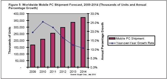 2009年全球移動PC出貨量增長19.6%至1.669億臺,到2014年將增長一倍以上,達到3.715億臺。
