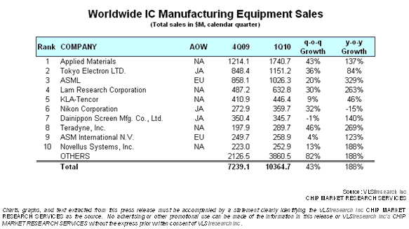 在VLSI 7月初發布的2010年Q1半導體設備公司銷售統計中,中小公司的業績增幅達到了82%。由于SOC測試的增長,Teradyne以46%的季度增幅列前10名設備公司增幅榜首。穩居業界老大寶座的Applied Materials增幅與整個業界持平,為43%。半導體設備Q1的總銷售額達到了104億美元,面對市場的普遍反彈,業界一片歡呼。相信下周 SEMICON West的party也將成為普天同慶的盛會。