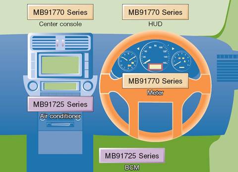圖一 儀表盤控制及車身控制MCU在汽車中的應用(以MB91770系列和MB91725系列為例)