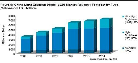 另外,憑借政府的支持和LED日益進入液晶電視及普通照明等新的應用領域,iSuppli公司預測,2014年中國LED營業收入將達到71億美元,而2009年是34億美元,其間的復合年度增長率為12.8%。超高亮度(UHB)LED的增長速度更快,到2014年銷售額將從2010年的6.86億美元上升到18億美元,復合年度增長率為26.9%。