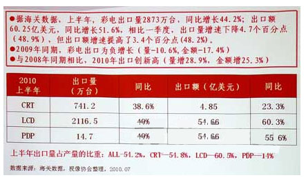 - 2010年上半年,彩電出口總量為2873萬(wàn)臺(tái),同比增長(zhǎng)44.2%