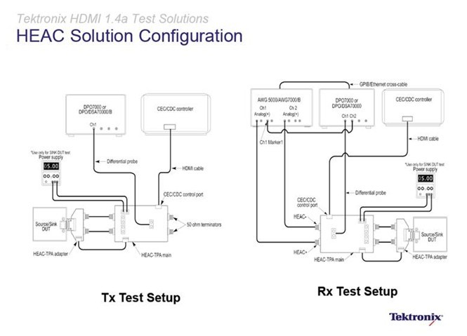泰克的測試解決方案不僅Type D(移動HDMI)和Type E(車用HDMI)新興應用通吃之外(無需硬件仿真器,并且相關夾具產品都通過了CTS1.4的批準),而且還能實現驗證HDMI 以太網和音頻回傳通道(HEAC) 、3D HDMI強制格式、4K x 2K 和新的色彩空間格式。HEAC的物理層測試包括以太網發送、接收測試;音頻發送、接收測試;以及設備阻抗測試和線纜測試。同樣是通過軟硬件結合進行模擬的方法使得用戶無需投資購買更多測試儀,只要購買相應夾具,可在原有示波器、信號發生器的基礎上進行配置,可產生真正的HEAC信號。