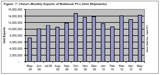 據(jù)iSuppli公司,由于第二季度全球?qū)P記本電腦的需求強(qiáng)勁,中國(guó)5月筆記本電腦出口量創(chuàng)下紀(jì)錄高位,幾乎是2009年5月的兩倍。