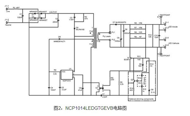 安森美半導體的NCP1014LEDGTGEVB評估板可驅動1至8顆大功率高亮度LED。該設計基于集成了帶內部限流功能的高壓電源開關的緊湊型固定頻率脈寬調制(PWM)轉換器NCP1014構建。由于NCP1014采用固定頻率工作,電流不能上升到高于某個特定點;導通時間的限制使輸入電流將跟隨輸入電壓的波形,從而提供更高的功率因數。評估板電路圖見圖2。
