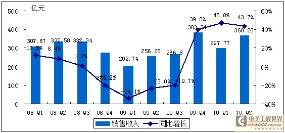 2010年上半年中國集成電路產(chǎn)量為302.5億塊,同比大幅增長了49.4%,行業(yè)實(shí)現(xiàn)銷售收入666.03億元。與2009年上半年458.99億元銷售額相比。增長了45.1%。上半年的高增長主要得益于國內(nèi)外市場的快速增長,以及去年上半年行業(yè)低谷的低基數(shù)效應(yīng)。整體來看,今年上半年產(chǎn)業(yè)銷售額不僅已恢復(fù)到2008年上半年的規(guī)模(2008年上半年產(chǎn)業(yè)銷售額為640.25億元),更在此基礎(chǔ)上實(shí)現(xiàn)了一定的增長。