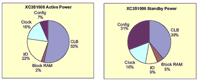 圖2所示為XC3S1000的活動功耗和待機功耗分解圖。據報告顯示,活動功耗是設計在高溫下活動時的功耗,包括動態和靜態功耗兩部分。待機功耗是設計空閑時的功耗,由額定溫度下的靜態功耗組成。CLB在活動功耗和待機功耗中占最主要部分,這不足為奇,但其他模塊也產生可觀的功耗。I/O和時鐘電路占全部活動功耗的1/3,如果使用高功耗的I/O標準,其功耗還會更高。[page]
