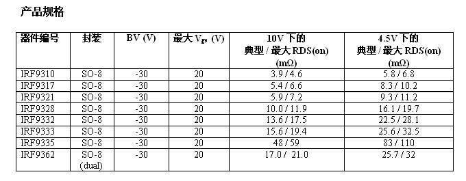 全球功率半導體和管理方案領導廠商 – 國際整流器公司 (International Rectifier,簡稱IR) 推出新系列-30 V器件,采用 IR最新的SO-8封裝 P 溝道 MOSFET硅組件,適用于電池充電和放電開關,以及直流應用的系統/負載開關。新款 P 溝道器件的導通電阻 (RDS (on)) 為 4.6 m?至59 m?,可匹配廣泛的功率要求。P 溝道 MOSFET 無需使用電平轉換或充電泵電路,使其成為系統/負載開關應用非常理想的解決方案。