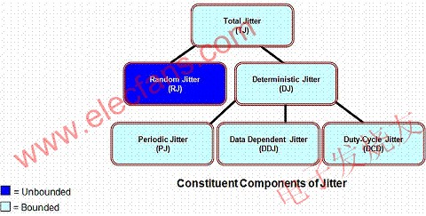 在這種分級結(jié)構(gòu)中,首先將總抖動分為兩類:隨機(jī)抖動和確定性抖動(Dj),然后再將確定性抖動分為若干類:周期抖動(Pj,有時也稱正弦波抖動或Sj)、占空比抖動(DCD)以及數(shù)據(jù)相關(guān)抖動(DDj,也稱符號間干擾ISI)。有時也會加入另外一個類別,即有界不相關(guān)抖動BUj。