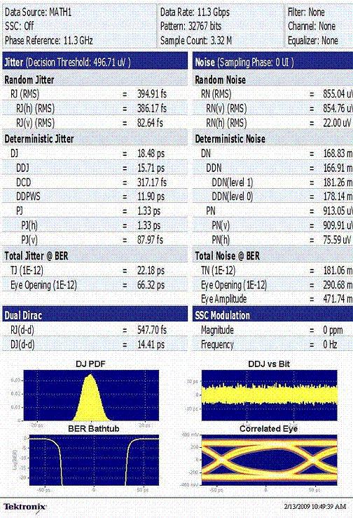 目前市面上性能最好的一款FPGA是數(shù)據(jù)率為11.3Gbps的AlteraStratixIV。圖5所示的測試報告,根據(jù)高性能采樣示波器采集的數(shù)據(jù)生成,當(dāng)Tj為22.18ps時Rj僅395fs。
