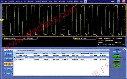 如果要測量在高信號速率時構(gòu)成Tj的各分量,應(yīng)采用本底噪聲低、頻率響應(yīng)平穩(wěn)、抖動測量底限低和觸發(fā)抖動小的儀器。例如,ONSemiconductor發(fā)現(xiàn)在檢定其高速ECL器件時,需采用系統(tǒng)抖動<200fsRMS而且?guī)捿^寬的儀器。芯片設(shè)計者發(fā)現(xiàn)幾個ps的信號移位,甚至是在fs范圍內(nèi)的移位,也可能干擾發(fā)送(TX)和接收(RX)性能。
