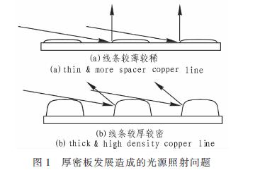 在PCB行業(yè)的發(fā)展中,目前存在以下3大趨勢(shì),即線條更細(xì)、線距更小密度更高、高度差更加明顯。本文使用的厚密板即是該趨勢(shì)的集中體現(xiàn)。如圖l(a)是普通光源應(yīng)用在線距大、厚度小的PCB上的光線路徑。圖1(b)是普通光源應(yīng)用在線距小、厚度大的PCB上的光線路徑。