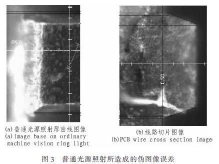 從圖中可以清晰地看到,目前的普通光源攝取的圖像和真實(shí)的截面圖有明顯的邊緣偏差,在2X的倍率下,1像素對(duì)應(yīng)的物面尺寸為1.61μm。偽圖像邊緣造成的線寬差別超過(guò)3像素。使得系統(tǒng)準(zhǔn)確度大為降低。該偽圖像邊緣產(chǎn)生的原因是由于普通光源光線照射角度過(guò)小。被厚密線路遮擋大部分光線后,基材和下線寬的亮度和顏色非常接近。而一般的線寬測(cè)試中,并沒(méi)有將該偏差計(jì)入測(cè)量結(jié)果。致使測(cè)量值產(chǎn)生一個(gè)固有方向的系統(tǒng)誤差,也就是說(shuō),如果該誤差不能被消除,所測(cè)得的數(shù)據(jù)不是真實(shí)PCB的線路特征的反映。而該誤差并不能通過(guò)改變圖像的清晰程度和對(duì)比度消除,只能依據(jù)PCB厚密線路的特點(diǎn)去改變光源的設(shè)計(jì)來(lái)消除或減小該誤差。