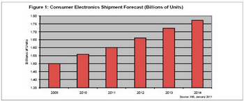 預計2011年消費電子產品出貨量將達到16億個,而2010年是15.6億個。消費電子包括多種我們熟悉的產品,消費者每天都會用到,如電視、立體聲和音頻部件、便攜媒體播放器、機頂盒、游戲機、DVD和藍光播放器、數碼相機、投影儀和攝像機、數字相框、電子書閱讀器和消費電器。