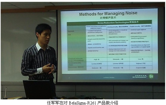 生活在都市的人們通常會在嘈雜的環境中撥打或接聽電話,人們總是希望能夠像在田野中一般獲得清晰并且沒有失真的聲音。對于手機廠商來講,采用能夠清晰拾取 語音并抑制噪聲的解決方案是關鍵。為了應對上述挑戰,安森美半導體推出了高性能語音捕獲SoC方案BelaSigna-R261。安森美半導體音頻與助聽 器中國市場開發經理任軍軍在日前的產品發布會上對BelaSigna-R261的特性做了介紹,并現場對產品進行了演示。