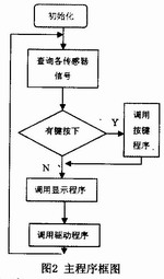 主程序的主要功能是循環調用顯示子程序、按鍵子程序,查詢各輸入信號狀態,根據按鍵設定的各種參數和各輸入信號狀態控制各執行機構,完成對PCB周轉箱托架系統的傳動控制,以及對PCB板的有序傳送,判別系統運行狀態是否異常,并及時報警或解除報警。主程序框圖如圖2所示。