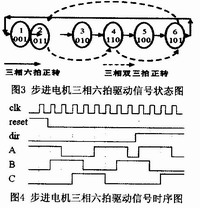 驅動子程序主要負責生成步進電機驅動器所需要的信號。當上行鍵或下行鍵按下,或者根據主程序運行結果,需要提升或降落周轉箱托架,主程序會調用步進電機驅動子程序。步進電機采用三相六拍工作方式,根據絲杠付螺紋間距,計算出步進電機每步進程,再根據周轉箱板間距,確定不同工況下,步進電機的正/反轉步數,這些步數保存在各相應存貯器里,供主程序調用驅動子程序時使用。圖3和圖4分別為步進電機三相六拍工作方式時驅動信號的狀態圖和時序圖。