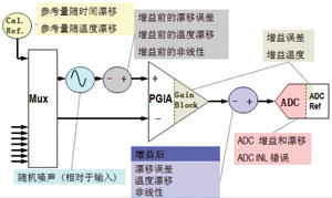 相對而言,精度的概念是指測量值與“真實”值之間的最大偏差的絕對值。如圖1所示,信號在整個數據采集系統中會受到參考量隨時間、溫度的飄移誤差、隨機誤差、非線性誤差、增益誤差等影響,這些影響綜合之后對測量結果所產生的影響就是我們所說的測量精度。